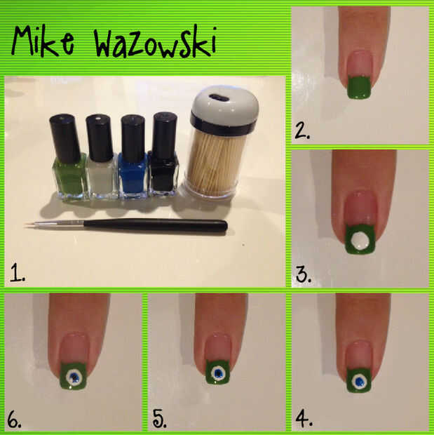 1. necesitas esmalte de uñas verde, blanco, azul y negro. Para añadir los detalles, se puede utilizar un cepillo del arte del clavo, pero si no tienes uno, palillos de dientes funciona bien.