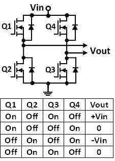 Hay un número de topologías utilizadas en los circuitos del inversor de corriente. Circuitos baratos adecuados principalmente para proyectos de aficionados a los hobbys pueden tener sólo un convertidor push-pull con un transformador elevador de tensión. Si tal convertidor utiliza una excitación externa sin control modo corriente, un transformador puede sufrir de desequilibrio de flujo que puede llevar a insuficiencia de transistores de potencia. El circuito descrito es un ejemplo de un diseño de una etapa. Más comercialmente fabricado modelos uso un concepto gradual. Con esta técnica, primero un pre-regulador conmutación genera un voltaje de la fuente de entrada a un nivel de DC regulado correspondiente al valor de pico de la tensión sinusoidal deseada. La etapa de salida genera entonces la CA. Esta etapa generalmente utiliza un puente completo (véase el diagrama a la derecha) o configuración de medio puente. Tenga en cuenta que con un medio puente, la tensión del link DC debe ser más de dos veces el pico de la salida generada. Entrada a salida aislamiento galvánico o proviene de un transformador de alta frecuencia en el regulador de la conmutación, o de un gran transformador de la salida de baja frecuencia (LF). Si se utiliza un transformador de LF, la sinusoide es generado en su lado primario y transformado en el lado secundario. También hay inversores sin transformador, que están ganando popularidad en sistemas solares.