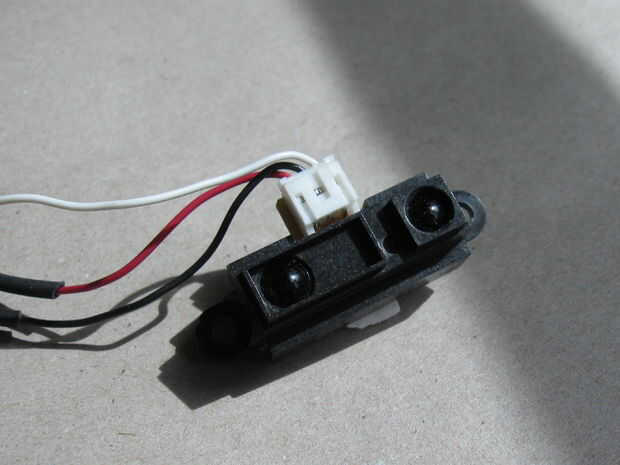 Un "ojo" envía infra rojo. El otro Ve el reflejo de esto (si hay uno), y la unidad vuelve a la distancia al objeto delante de él. Tiene 3 cables (Asegúrese de que conseguir el cable para o puede ser difícil de conectar). Da poder en 2 de los cables, y la tercera se enchufa en el microcontrolador y dice la distancia.