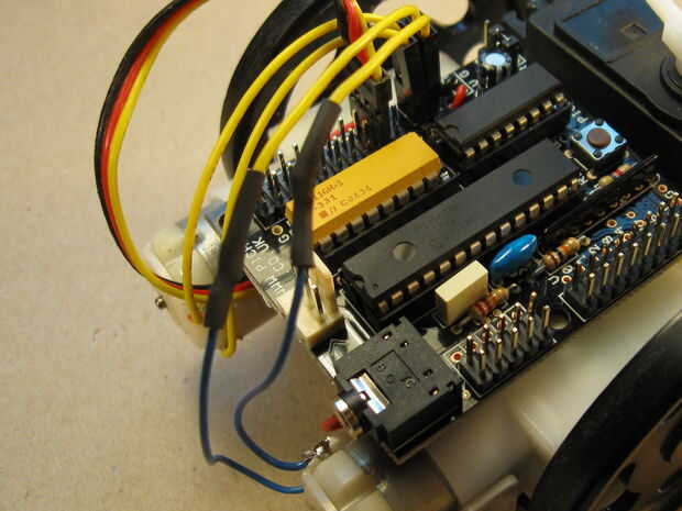 Vaya, uno de mis cables de motores era demasiado corto, así que añadido extensiones azul pequeño de un pedazo de alambre que encontré.
