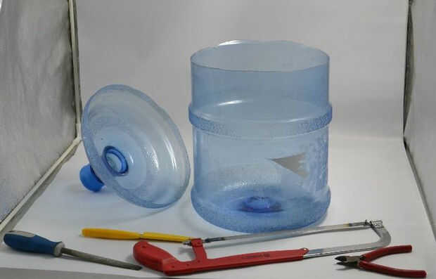 Parte el botellón de agua con la sierra (intentamos usar un cuchillo de cocina, pero el botellón resultó demasiado rígido). El botellón cuántos tenía una sección más cerca de la boca, donde lo serramos, para poder usar la pieza cortada como tapa más adelante. Después de serrarlo, alisamos los bordes con el papel de lija