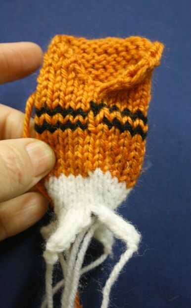 Transferir a una aguja circular y todas las puntadas de punto y unir en un bucle. Añadir un marcador redondo.