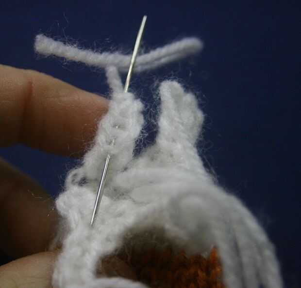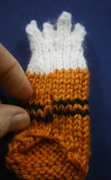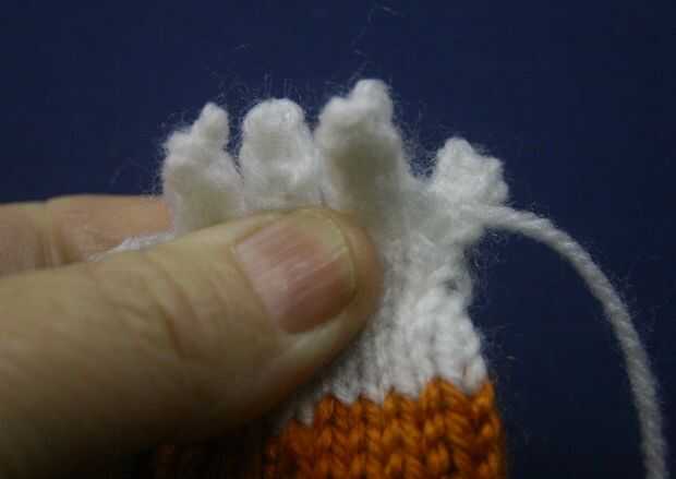Mantenga los dedos de tal manera que una línea de cuatro (véase el cuadro) y utilizando una de las colas de hilo, coser los dos lados juntos por lo que no quedan huecos. Hilo de rosca restante colas en el interior de la mano.
