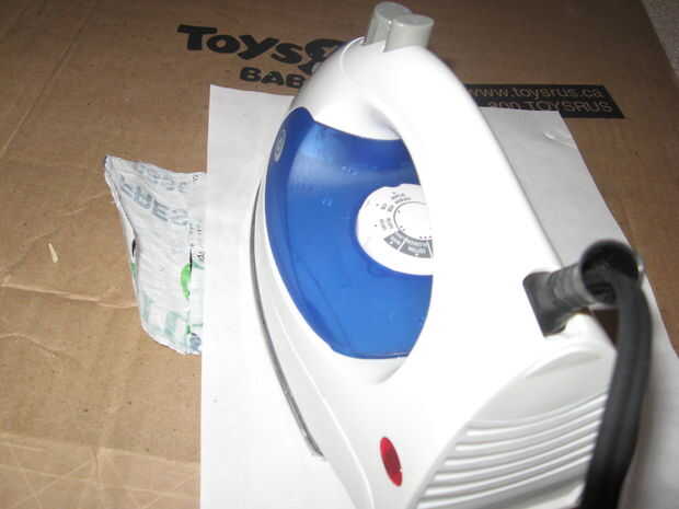 Doble maletas fundidas sobre el patrón de cartón, coloque un papel sobre él y usando la punta de la plancha de vapor los bordes hasta que se funden.