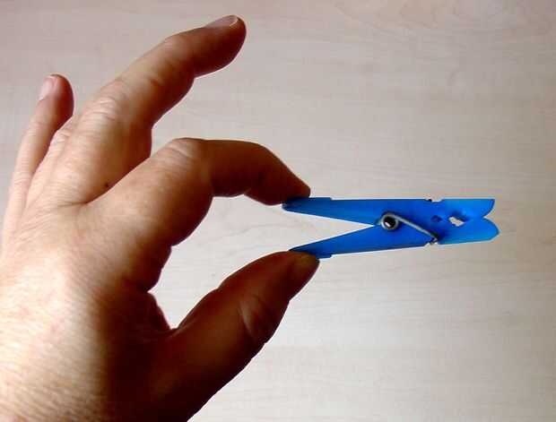Tomar los extremos abiertos de la clavija de ropa entre las puntas de los dedos de la mano izquierda y el pulgar. Sin ayuda de los otros dedos, lentamente cerca de la clavija de ropa juntos. Ahora permita que se abra otra vez - como poco a poco como usted puede. Repetir 5 - 10 veces.
