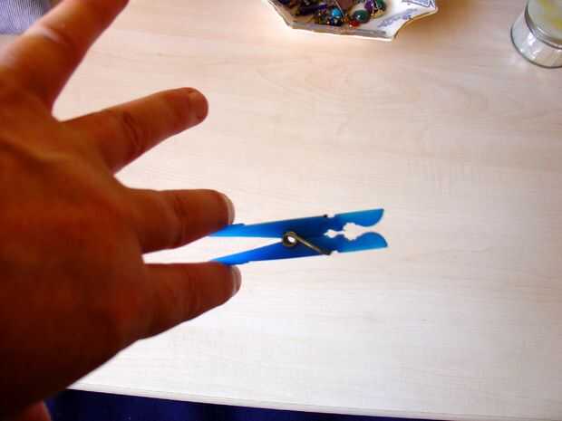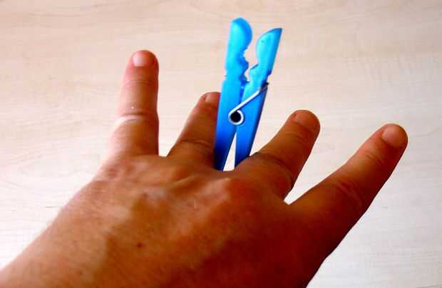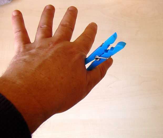 Luego ponga el extremo abierto de la clavija de ropa entre la base del pulgar y el nudillo abajo el primer dedo de la mano izquierda. Llevar el pulgar a cerca de la clavija; Abra de nuevo. Repetir 5 - 10 veces.