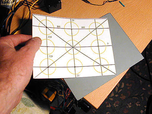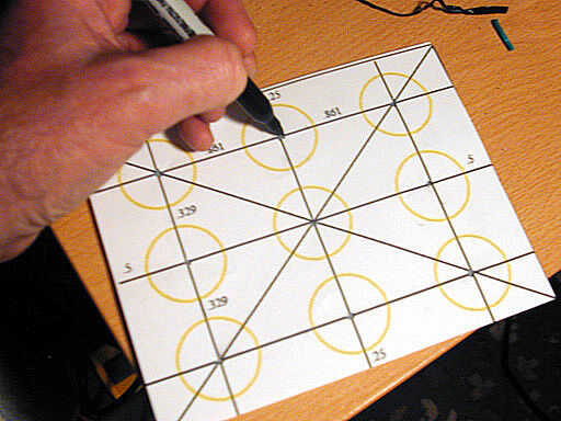 Tomar la plantilla que usted sólo imprime - y utilizando un punzón o tijeras pequeñas, cortar los nueve, pequeños agujeros negros. Luego coloque la plantilla en la parte posterior del acrílico espejo - y usando un rotulador o un lápiz - marca nueve puntos usando los nueve hoyos.