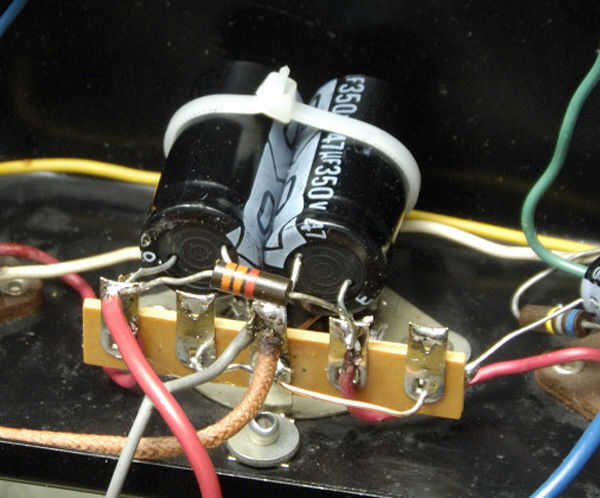 Cuando reemplace las tapas de filtro, no exceder los valores de capacitancia por mucho (pasé de spec uF 40 a 47 uF). ¿Más capacitancia suena bien, verdad? ¿Menos hum, dices? Desafortunadamente, amplificadores con rectificadores de tubo no pueden manejar valores de capacitancia alta--provocan picos de voltaje que se desgastan rápidamente los rectificadores. 60 - uF 100 es el máximo recomendado para este tipo de rectificador... cerca de los valores especificaciones aquí.