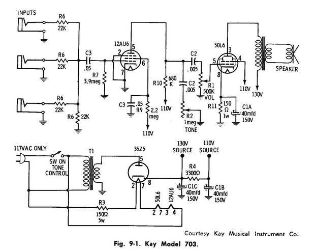 Búsqueda de esquemas de amplificadores similares. Encontré por lo menos 7 esquemas de amplificadores que utilizan 12AU6, 35Z5 y 50L 6 tubos. Comparar los esquemas para su amplificador. Tener ejemplos similares es la mejor manera de empezar, especialmente si no está familiarizado con el circuito del tubo.