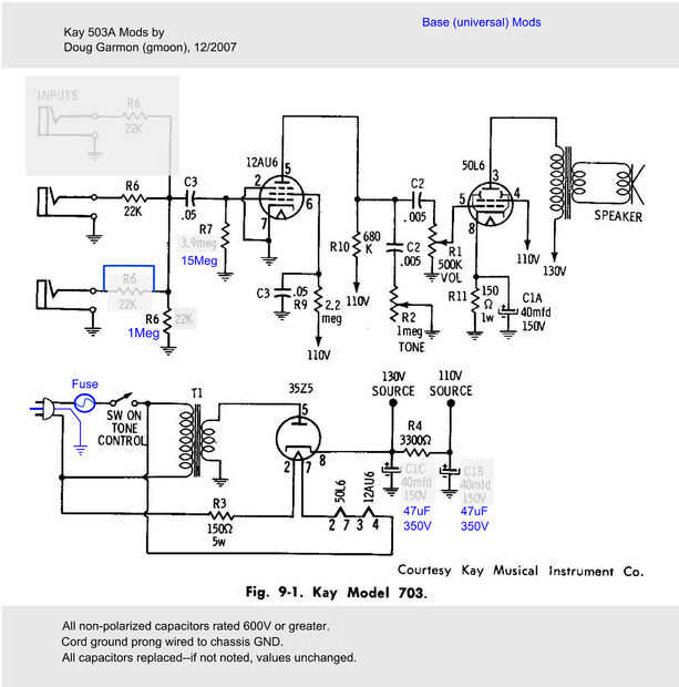 --La resistencia de fuga de la grilla en el preamplificador (12AU6 tubo.) Otros diseños similares para un preamplificador 12UA6 cayeron en una gama de Meg 2.2 a 15 megas. El 503 Kay tenía una resistencia de Meg 3.9--sustituyó a 15 megas. Esto da el preamplificador quizás un poco más 'ganancia'.