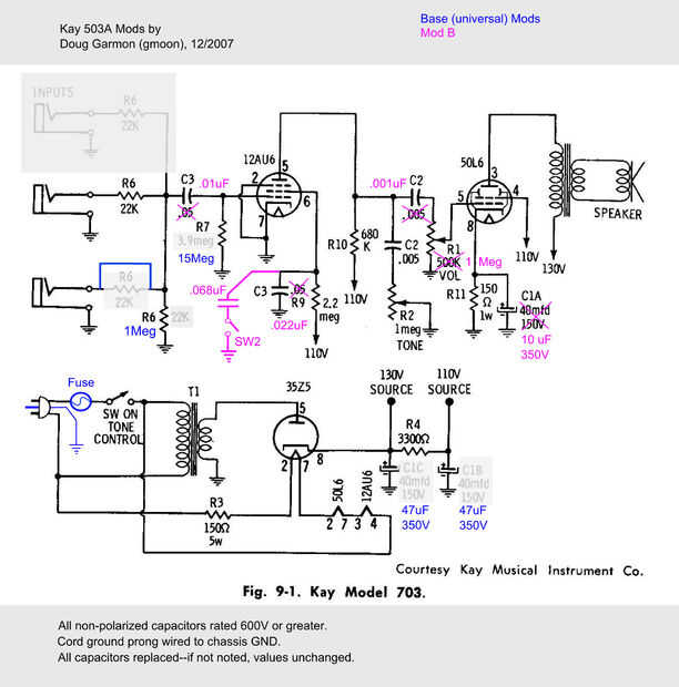 --Siguiendo el ejemplo de Silvertone amplificadores con tubos similares (1430, 1448, etc.) el primer casquillo de acoplamiento fue cambiado de.05 a .01uF, dando por resultado un buen impulso para el high-end.