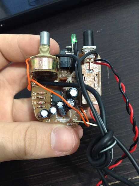 Después de la impresión, hice algunas pruebas para encontrar la ubicación correcta de los agujeros, usé un equipo amplificador aunque yo había guardado aquí, en primer lugar él no cupo dentro del cañón, así que tuve que cortarlo para él para entrar y no echar a perder, hecho algunos puentes para ayudar, he cambiado la posición LED para no dejar demasiado apretado...
