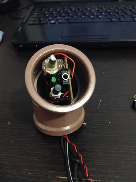 Después imprimir UE fui fazendo uns testículos para achar os lugares certos dos furos, UE empleo um amplificadorzinho de computador mesmo eu tinha aqui guardado, de cara ele não coube dentro cano então UE fui cortando ele de modo não estragasse, fiz alguns puentes para ajudar, troquei o LED de posição pra não decriptar tudo meio apertado...