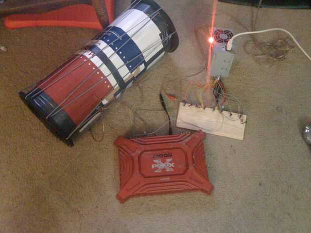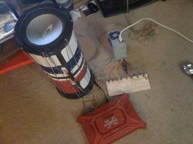 Tuve dos Alpine 10 pulgadas subs y una 500 W Sony Xplod ahí. Después de varios experimentos y muchas preguntas en instructables.com y google desmonté mi psu para limpiar hacia fuera y ver si podía poner el verde (en) corta a un interruptor (que no corté un conjunto todavía). Luego cortar todos los cables y había atado junto con algunos conectores terminales (para facilidad de experimentar). Conecté el amplificador y poner los dos subs en serie y usa las salidas estéreo (100 W a 4 ohmios) para conectar los altavoces con un altavoz fuera de fase (polaridad invertida). Utilicé una caja de cartón cerca de 22 pulgadas largo para crear el tubo a mano para ablandar para arriba y luego establecen lo plano otra vez, antes de realmente rodar alrededor de los altavoces tuvo algunos pequeños pedazos de cartón y pegado a los imanes para ayudar a alinear mientras rueda la caja más grande alrededor de ellos. Grabado en el cartón la pieza interna de estructura de la bocina, no sólo envuelve la parte exterior. Esto es importante en el paso siguiente. Había terminado rodando la caja luego envuelto en cinta firmemente por ambos extremos con la cinta más, lo más cerca del metal como podría conseguirlo. Tomé algunos cable viejo (cuz no pude encontrar mi pelota de guita) y funcionó a través de cada uno de los agujeros (donde los pernos van generalmente) y atados juntos en ambos extremos. Envuelve alguna cinta alrededor del centro para apretar estos cordones de cruce, luego pegado los vacíos que podría administrar.