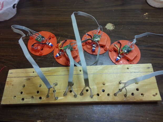 En los tres agujeros exteriores que ha perforado en la inserción de la pieza del fondo el LED hasta ras, añadir un anillo de pegamento caliente en la parte inferior de las luces para dar estabilidad. Escoge cuatro agujeros al azar para poner las luces para un aspecto más estético al final.