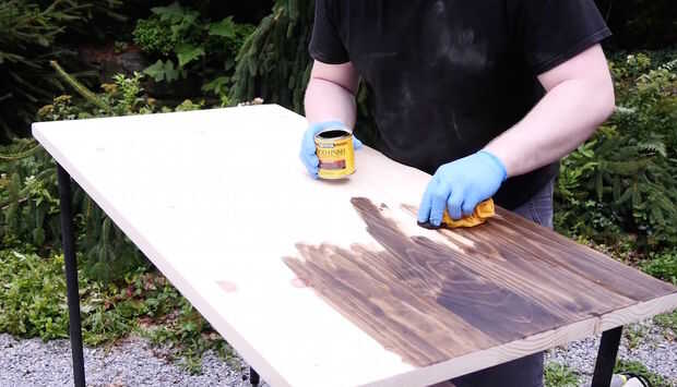 Flip a la tabla vertical y mancha la parte superior de la tabla. Una vez que este haya secado durante al menos 4 horas, aplique una fina capa de poliuretano a la superior, inferior y lados de la mesa. Que sentarse durante cuatro horas, lije con lija de grano 220 y aplique otra capa delgada de poliuretano.