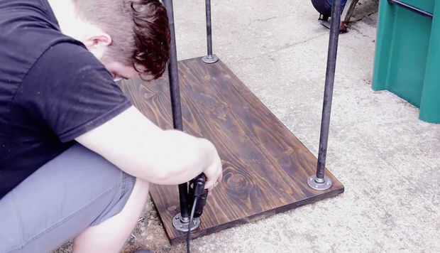 Una vez que se realiza el acabado, se alinean las patas en los orificios previamente perforados y utilice los tornillos para fijarlos en su lugar. Voltear el escritorio vertical hacia atrás y deje que se seque durante al menos 24 horas antes de usar.