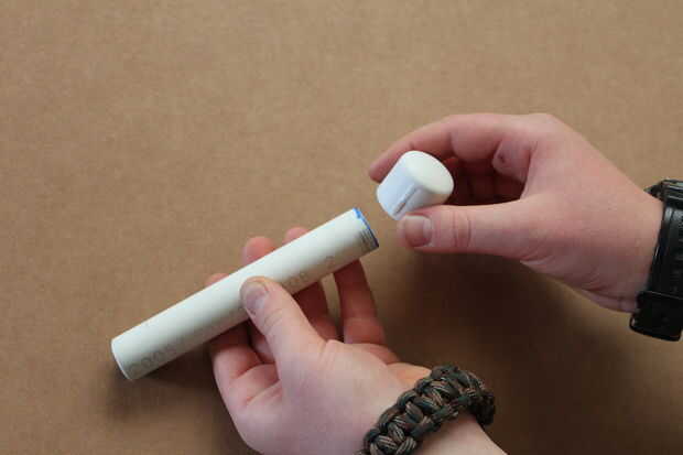 En primer lugar, corte el tubo de 1/2 pulgadas PVC a la longitud que desee y limar cualquier asperezas. Luego, pegamento en la tapa de un extremo a un extremo de la tubería y perfore un orificio en la parte superior de la tapa del extremo que no está pegada a la tubería.