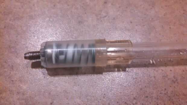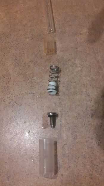 Corte un trozo pequeño (1/2-3/4") del tubo de vinilo y empuje en la parte superior de la carcasa de la bomba en la parte superior del resorte. Debe haber espacio para comprimir el resorte.