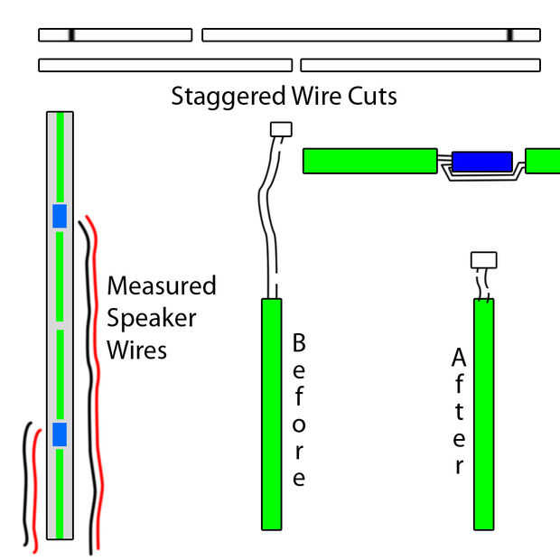 Este es un truco que no sólo hace para cableado limpiador, pero evita la posibilidad de los cables en cortocircuito hacia fuera, o en el caso de tratar con alto voltaje, reduce grandemente la cantidad de fugas en los puntos débiles donde cortamos. Cuando usted corta los cables, simplemente realice un corte una pulgada o dos de largo que el otro. Hacer lo contrario para el lado opuesto, del conector. Otra vez, mirar las imágenes de referencia. Cuando se suelda, emparejarán perfectamente, con cortes alrededor de una media pulgada aparte.