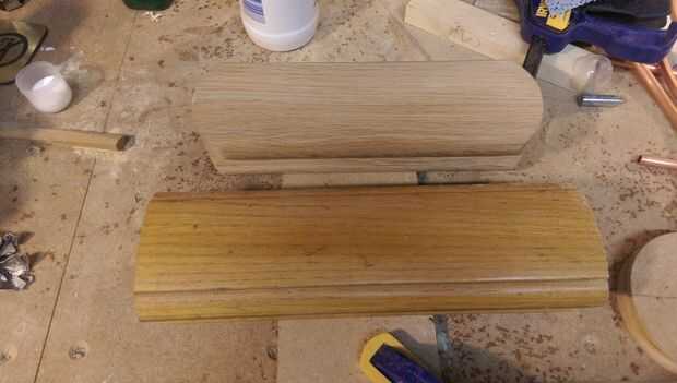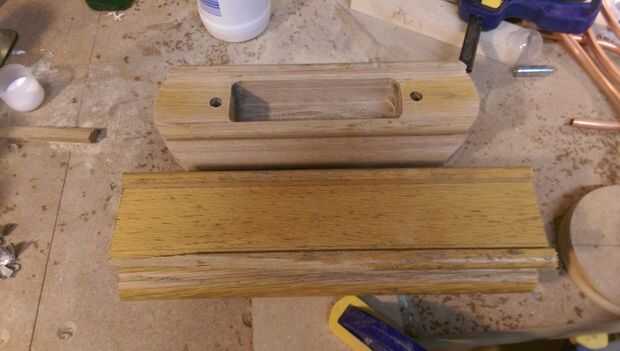Iba a mantener la curva superior de la sección de bannister, pero decidió despegar con un molino de extremo de la fresadora para dejar una superficie plana que tenía los bordes bien redondeados con la forma existente de la sección. Darle vuelta y sujeción en la parte superior planchas de madera fina para proteger la parte superior me marcaron y cortar el hueco para la electrónica en la base como se puede ver en la fotografía.