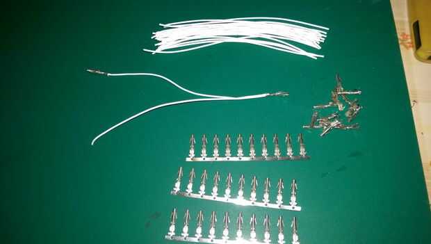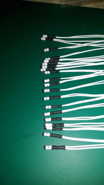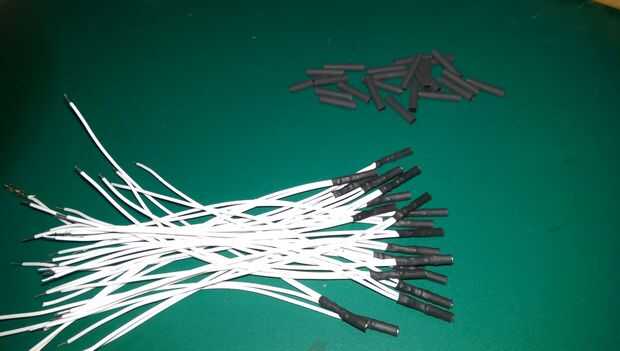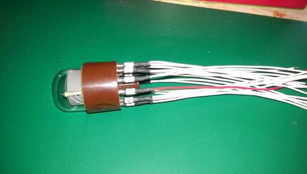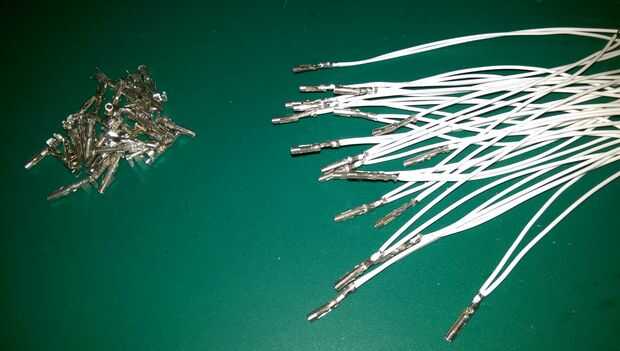 Que cortar todos los cables necesarios para longitud y equipadas las tomas de conexión a un par de cables para cada pin. Encogimiento de calor había cubierto los extremos expuestos y fueron numerados para la conexión a los pines en los tubos de Nixie. Las tomas están conectadas a los pines y los extremos libres de los cables son alimentados a través de los tubos a ambos lados y luego las tomas equipadas, calor reducido y contados antes de conectar al siguiente tubo Nixie.