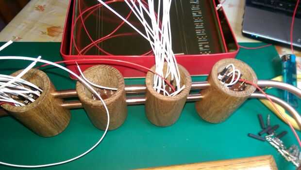 La LHS conexión tubo de cobre tiene 11 cables que salen de él, el otro tiene 12, el siguiente tiene 13 cables y finalmente, el tubo de cobre de RHS que alimenta a las placas de circuito tiene sólo 14 alambres (4 ánodos y cátodos de 10) por Margarita chainng los cátodos y utilizando el circuito de multipexing electrónica de PV. Es sólo un caso de a partir de un tubo y conectar los cables a los pines seleccionados de cada tubo entonces la alimentación hasta la Junta del tubo de Nixie. Los cables de 10 cátodo que el tubo de cobre a la hendidura se sueldan luego a una de las secciones de almohadilla de conexión de tubo de Nixie existentes.