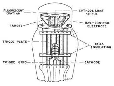 Tubos de ojo mágico son básicamente una pantalla CRT dentro de un tubo de vacío. Como se puede ver en el diagrama de abajo, el anillo superior está recubierto de sulfuro de cinc, que se ilumina cuando golpeó con electrones. El tubo de vacío debajo de la pantalla se activa una corriente de electrones hacia la parte superior del tubo. Para ajustar el ancho de la cuña que se enciende, un electrodo de control de ray crea un campo eléctrico que repele esta corriente de electrones. Así como cambia el voltaje en ese electrodo de control, electrones que afectaría la zona cerca de él se rechazan lejos, y para que parte de la pantalla se queda oscura. Hay un punto negro en el centro del tubo que protege la luz roja de la placa triodo que calienta mucho y es la fuente de la corriente del electrón. Esto hace más fácil ver la pantalla verde.