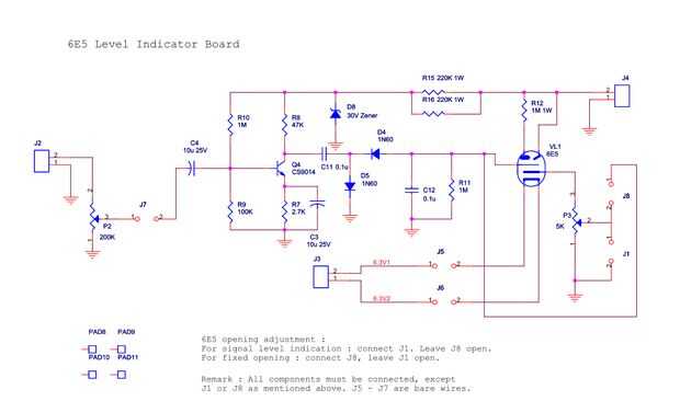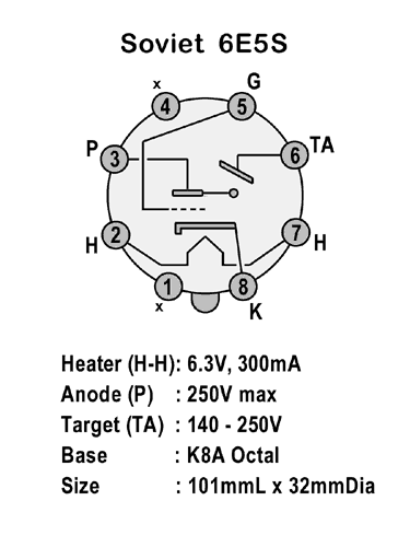 Aquí le damos la hoja de datos para el tubo 6E5, que es lo que este esquema es para.  Nota que el esquema aquí tiene una línea sólida para el pin de red del tubo, y normalmente es punteado (el pin de red es el conectado a R11).  Esto es lo que significan las letras en el cuadro de asignacion de terminales: