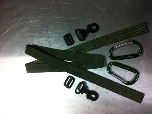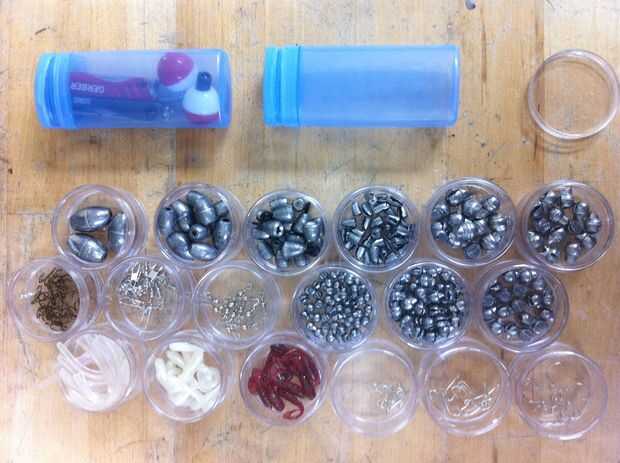 La correa y cualquier extra está hasta usted. Para los compartimientos pongo pesos, gorrones, broches, ganchos y gusanos artificiales. En la parte inferior puse dos bobbers y una navaja suiza o un centavo de Gerber. Hay todavía muchos espacio para línea extra o cualquier otro equipo.