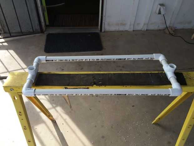Coloque un 3.5" se convierte el pedazo de 90 grados, luego acople Ts a ellos. Adjuntar otro 3.5" pieza en T que es paralela a otra, a continuación, añadir un giro de 90 grados y una longitud de 24". Esto debe completar un lado. Puedes ver como se ve en la foto de arriba con la pieza en un caballete amarillo. Repita el proceso para el otro lado.
