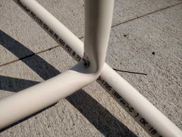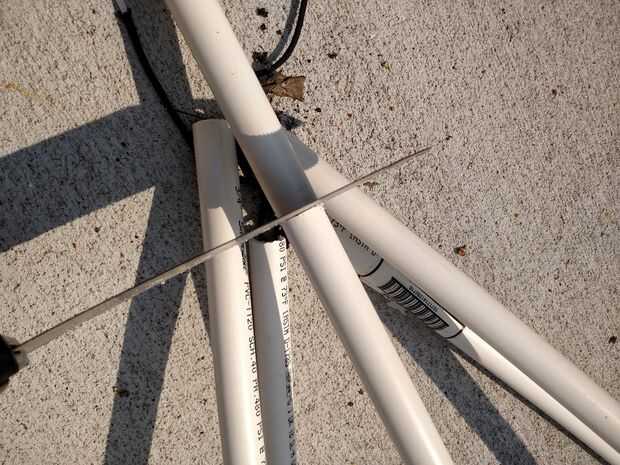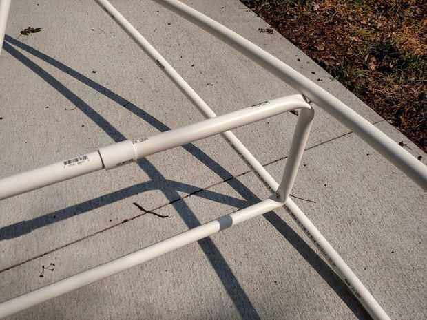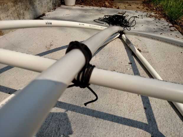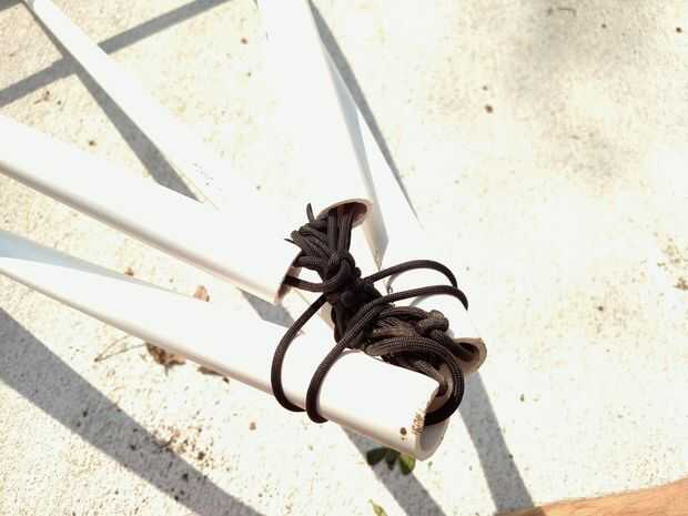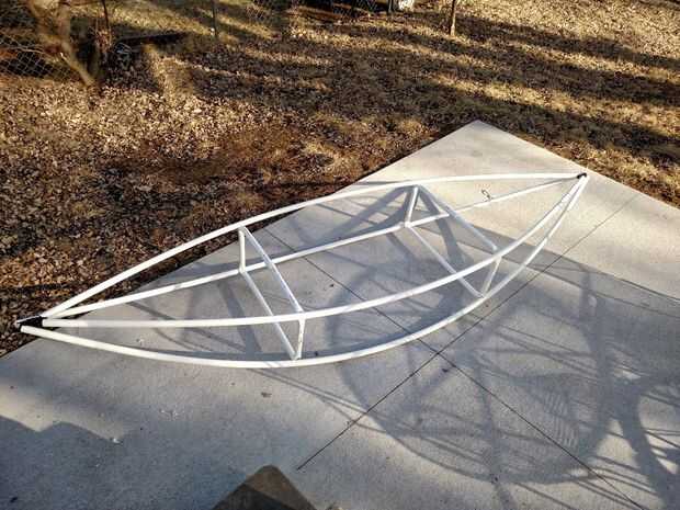 En esta etapa, he decidido el kayak debe ser más seguro y tienen una forma más estable, así que tomé otro 10' segmento y había unido como una "quilla". Esto se hizo por primera vinculación al grupo de cuatro puntos en un lado. Luego había doblado sobre el otro lado y cortar a la longitud. Después de atar esta pieza en ambos lados, luego añadí pestañas puntos donde estableció contacto con las costillas para añadir estabilidad.