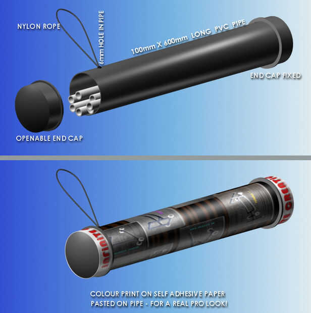 Una de las tapas puede ser cementada permanentemente a la tubería. La tapa del extremo actuará como la tapa. Grey estaba buscando un poco aburrido así que rápidamente había compilado algunas fotos, impresas sobre papel auto-adhesivo y había pegado sobre el tubo.