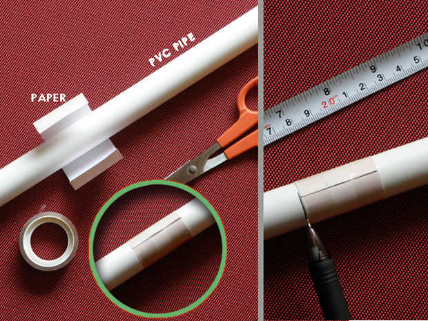 Usando cinta de cello y la tira de papel, hacer un tubo de papel. Rollo de tira de papel sobre el tubo - no demasiado apretado - apenas lo suficientemente suelta para que se deslice fácilmente sobre el tubo. Esto se convierte en su marca Jig. Ahora puede deslizar el tubo de papel en la posición deseada y trace una línea (en el tubo) en el borde del papel.