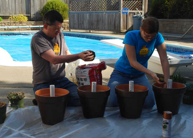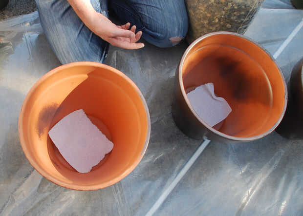 Ahora, poner algunos puñados grandes de rocas en el fondo de cada maceta. Pensar en una pulgada de grava.
