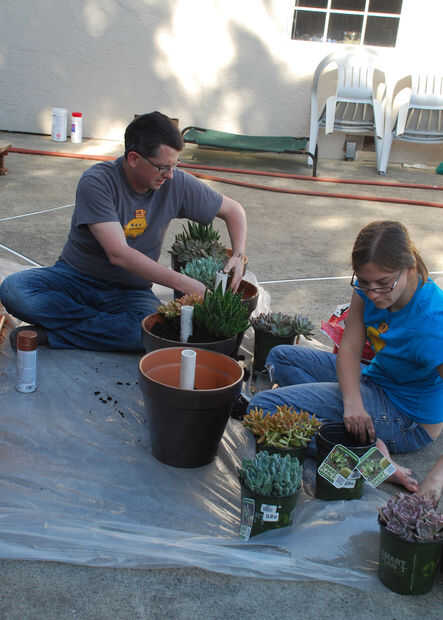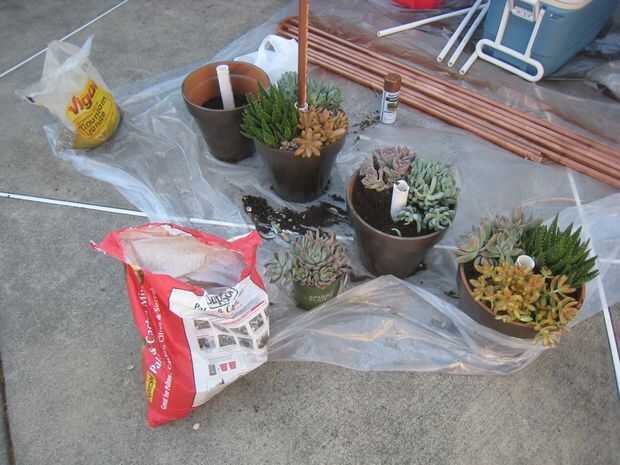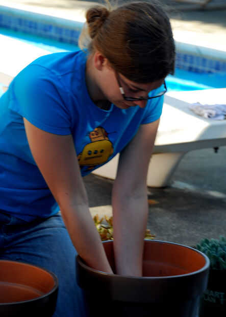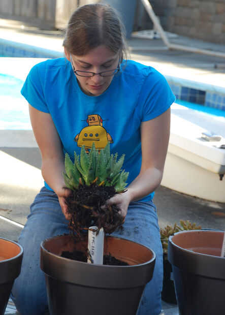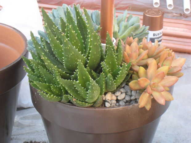 Tiempo para la suciedad! Consigue tu cactus suelo y montón en unas pocas pulgadas encima de la grava. Trabajar su primer suculento de su cubo de plástico y medir contra la altura de la tierra. Desea la suculenta para estar en el borde de la maceta, para ajustar la altura de suciedad por consiguiente. Afloje un poco el cepellón de la planta suavemente aplastando en la suciedad alrededor de las raíces hasta que ya no es forma de cubo de plástico. Luego, aplastar la cosa derecha abajo en el bote. Repita con las otras dos suculentas, por lo que su tubo de anclaje es hueco y rodeado de cactus. y rellene alrededor de ellos con más tierra de cactus. Terminar con un poco de su grava sobrante en los boquetes entre las suculentas. Hace maravillas para ayudar a la completa el look!