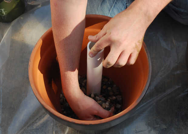 Ahora coloque el tubo de anclaje encima de la grava. Tratará de volcar. Poner otra pulgada de grava alrededor de la tubería para mantener en su lugar.