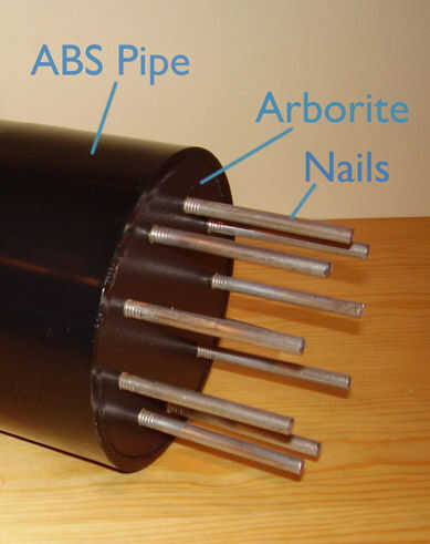 Perfore agujeros bien espaciados en la madera, apenas lo suficientemente grande como para admitir los clavos y pegamento caliente las cabezas de los clavos a la madera en lo que será el interior del tubo.