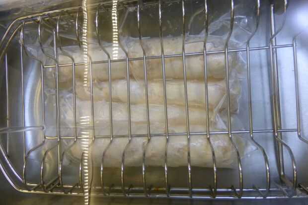Fuera de la bañera de agua con pinzas, enfríe rápidamente las bolsas en agua del grifo. Un montón de jugo de carne es liberado durante la cocción, pero aún está en la bolsa. Así que mantenerlos durante la noche en la nevera para dejar ese jugo volver en la carne. Congelar o servir.