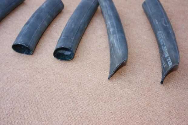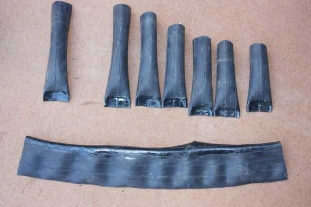 Mientras esperaba para que el pegamento se seque, empecé cortando el pedazo de forro de llanta 500mm(20'') largo. La matemática era mis 7 bolsillos 50mm(2'') amplia Plus un 150mm(6'') extra para la aleta. La pieza extra asegurará que no hay las que se exponen. Los tubos que cortan capa abierta longitud sabio formar una sola espalda.
