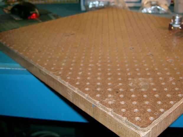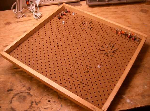 me da casi vergüenza decirlo que no construyo el protoboard.  Es muy simple: un pie cuadrado más o menos de 1/8 de pulgada espesor perf Junta mantuvo a raya el Banco por cuatro piezas de 1/2 x 1/2 madera y clavos de acabado pequeños.  Podría realizarse en unos 20 minutos si las partes estaban en la mano.