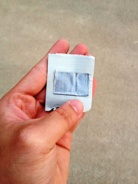 Una vez que estos agujeros perforados es hora de sacar la cinta del conducto. Hice los parches con un trozo de cinta sobre el adhesivo de otro pedazo de cinta adhesiva (ver imagen). Éstos van sobre los agujeros en el interior del tubo. ¿Por qué, usted pregunta? Es así que la cabeza del tornillo no rasgar los agujeros en las bolsas. No es generalmente una buena idea intentar vaciar caja de litera de un gato en una bolsa con agujeros en ello... por lo que este debe evitar que esos agujeros. El pedazo de la cinta que cubre el adhesivo simplemente ayudarán a permitir que el tubo a la pared sin estropear la cinta.