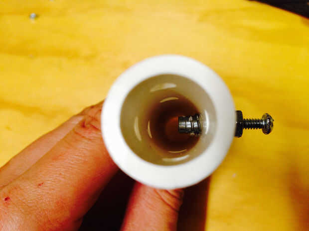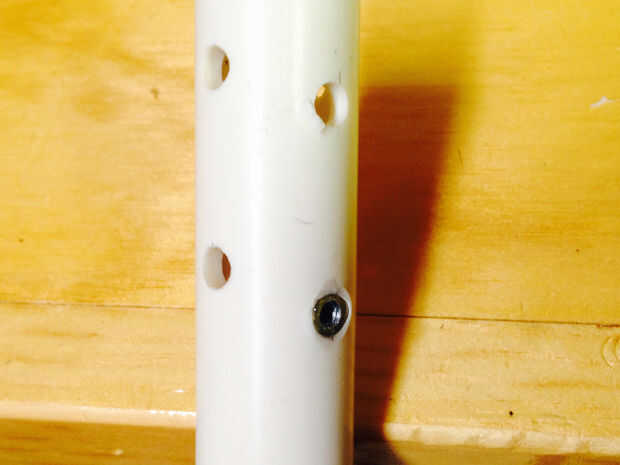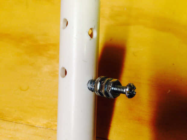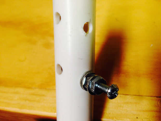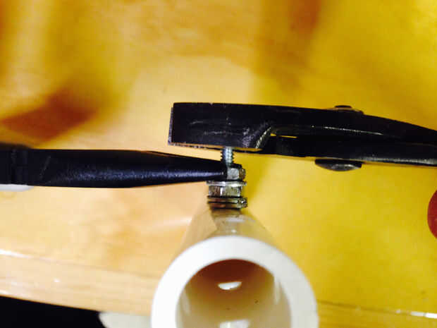 Una vez que tenga los agujeros perforados, tendrás que perforar en los insertos roscados. He utilizado un tornillo de máquina con tres arandelas y dos tuercas. El tornillo en la parte movible del hilo de rosca y colocar el inserto en el agujero. Luego, enrosque el inserto. Una vez que el prospecto lo más cerca posible a estar al ras con el tubo, usted necesitará sacar el tornillo de la máquina, dejando el inserto roscado. Si usted desenrosca el tornillo de máquina y el relleno sale con él, necesita dos alicates para conseguirlo suelto. (Sosteniendo el tubo de PVC todavía, utilizar los alicates para sujetar el tornillo de máquina, durante el uso de los alicates de punta para aflojar las tuercas.)