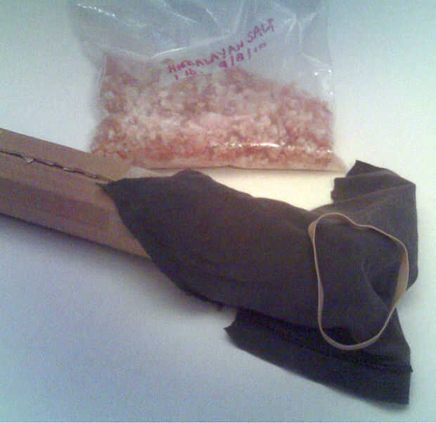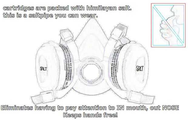 Primera encarnación = un tubo de cartón de una caja de pizza. Una pequeña plaza de camiseta jubilada en un extremo, sujeto por una banda de caucho. Tubo lleno hasta la mitad con cristales de sal de Himilayan. Inhale suavemente por la boca, exhala por la nariz. Whadd'ya sabe, una pipa sal DIY! Estoy seguro de que esto Replica la función mecánica de la pieza de $40, para barato. No es lujo!