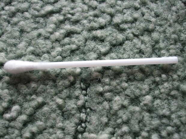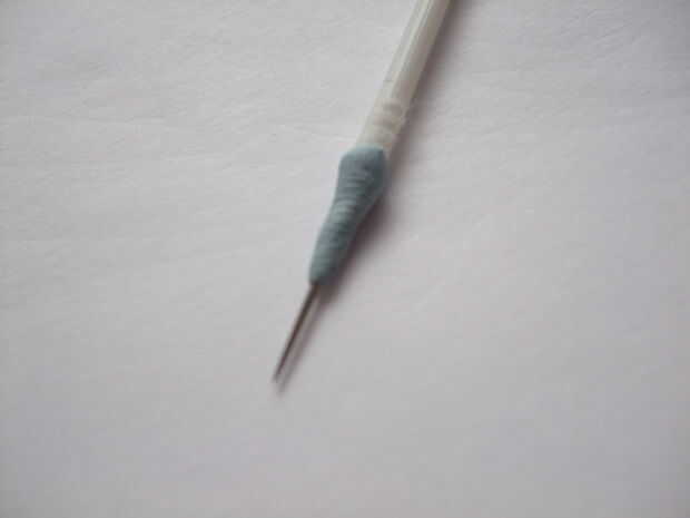 el bastoncillo de algodón y tire de la lana en un extremo. tomar la aguja y ponerla en el agujero (sus bastoncillos de algodón no tenga agujeros, mi son tubos huecos) por lo de alf es mostrando la aguja. poner la bordada azul alrededor de la tib de la yema de algodón para sujetar la aguja en su lugar.