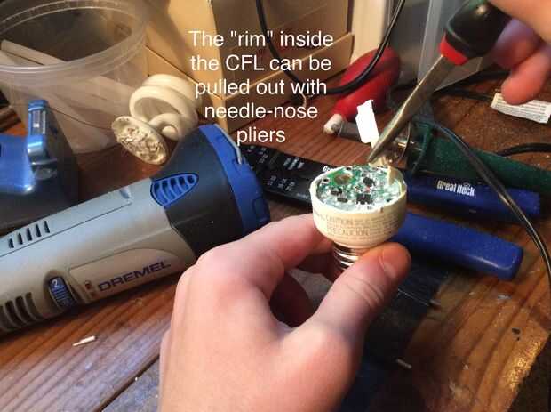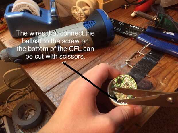 Cuando nos fijamos en el lado de la CFL que contiene el Balastro, lo más probable es que usted verá un plástico flojo "borde" entre la Junta y el lado del compartimiento se encuentra en. Esto se puede sacar con un par de alicates. Una vez que han tirado el borde que usted necesita cortar los cables que van de lastre al tornillo en la parte inferior de la CFL que normalmente se ajusta a una toma de luz. La forma más sencilla de hacer esto es inclinar el tablero a un lado por lo que puede caber un par de tijeras en el boquete. Use las tijeras para cortar uno de la wies y entonces incline la junta al otro lado de manera que puede cortar el otro cable. El resultado final es un tablero separado que puede ser salido de la caja y salvar más. El resto del tubo puede ser descartado, pero la luz contiene mercurio por lo que puede que desee consultar a su personal de residuos maneagement para más detalles.