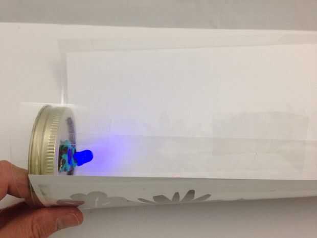 Poner una hoja de acetato sobre el papel y enrollar el papel y acetato alrededor de las tapas del tarro. Fije los bordes uniformemente con cinta transparente.