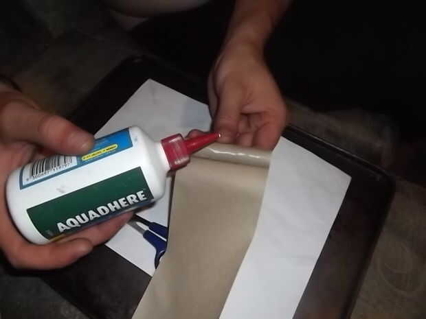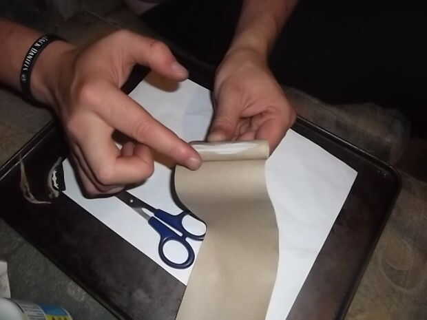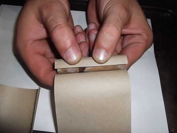 Cuando sienta que está alineado correctamente, hacer un rollo completo de media y luego aplique una franja de pegamento a lo largo del papel. Nota: Si usted no hace el giro, el papel se atranca en el formulario y no podrá salir más tarde la espiga! Si quieres estar totalmente seguro de que el papel no se adhieren a su forma, corte una tira pequeña de papel, rollo y luego cinta de él. Luego pegue la larga primera tira de papel para.