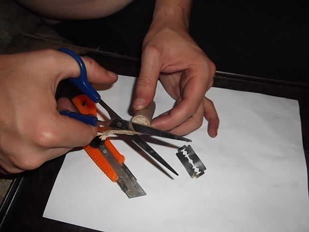 Una vez que estés feliz con forma de tubo, corte para arriba con cualquier medio posible la longitud de la espiga o la longitud deseada. Si rodó el tubo bajo su mano, esta ordenado hacia los lados así que usted puede quitar la forma un poco otra vez. Tengo el formulario en una mano y el tubo en el otro, torciendo y dando una ligera presión hasta para hacer un tubo muy bien formado.