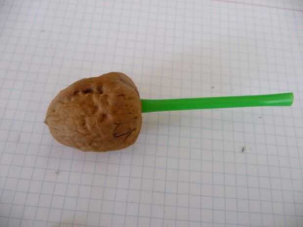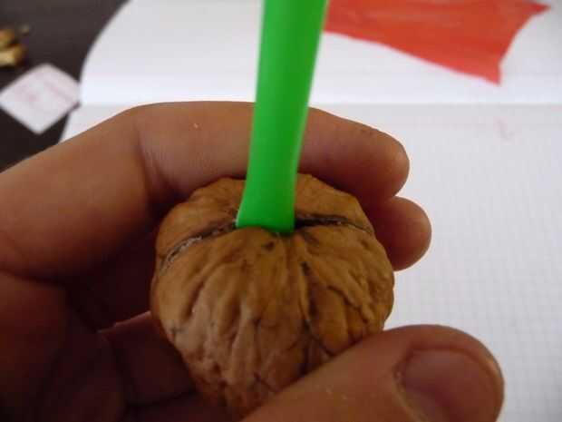 Ahora que el pegamento esté seco apuñalar la tuerca con el palillo del lollipop o paja en la cabeza detrás de la tuerca. Normalmente permanece lo suficientemente apretada. Si usted sostenga la tuerca con el palo de paja/paleta hacia abajo y no cae hacia fuera está bien. Si se cae un uso un poco de pegamento.